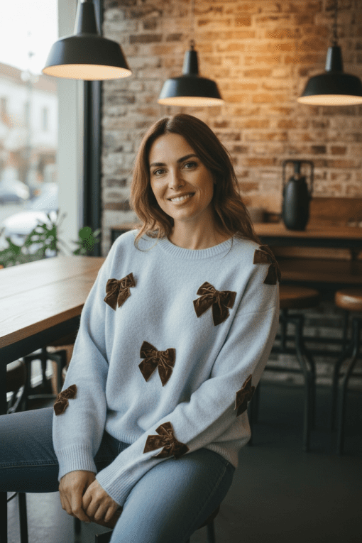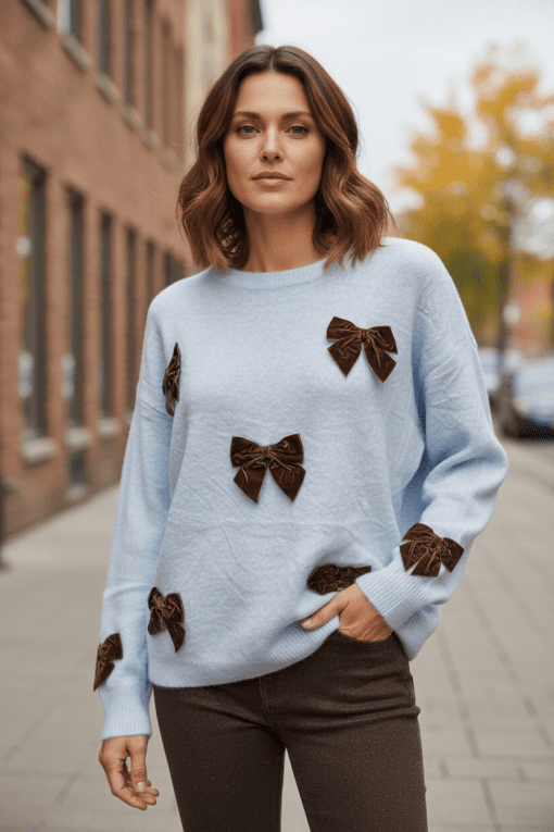 Heerlijke warme trui met sierlijke bruine strikken erop.